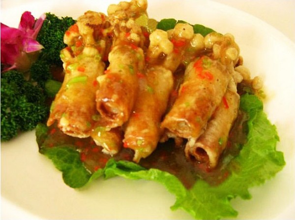 素东坡肉切成薄片,金针菇切成段,素东坡肉卷上金针菇,用牙签串一下定形,然后拍上淀粉,放入热油炸至金黄色捞出抽去牙签装盘,另起锅放入调料加水勾成欠汁淋在炸好的金菇卷即可。