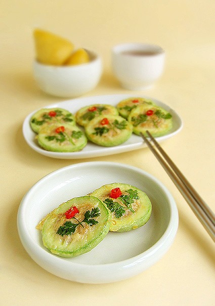 6、将拌好的豆腐素肉馅放入西葫芦中。