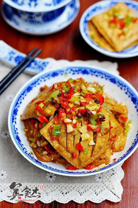 第5步炒锅另热少许油,加入剁碎的红椒,炒香,加入盐,生抽,白糖,再烧制1分钟即可;将炒好的浇盖料淋在卤好的豆腐干上即可