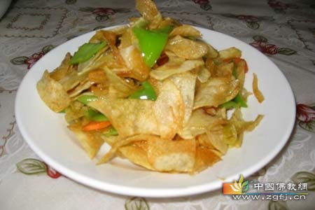 1、将土豆切成薄片,用清水浸泡,用热油炸制金黄色,脆硬时捞出控净油。
