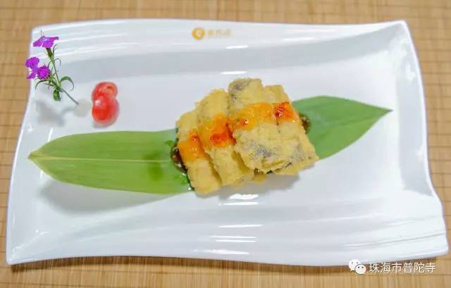 6、起锅热油,待油温五成热时,将腐皮卷裹上面浆放入锅中炸至金黄酥脆,捞出沥油,摆入盘中,淋上甜辣酱即可享用。