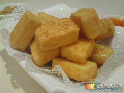 12. 至微黄色捞出,摆入盘内,每个豆腐盒上放一个红樱桃点缀,盘边置上炒好的菠菜即成。