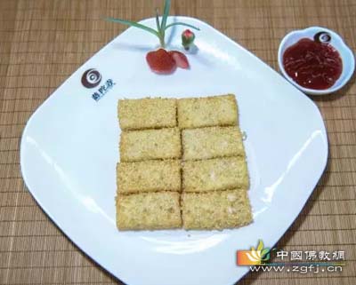 3、起锅热油,待油温六成热时,放入芝麻豆腐炸至金黄色捞出沥油,摆盘跟上番茄辣椒酱即可。