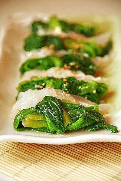 2、把菠菜分别卷成小卷,和魔芋卷一起加盐、醋、凉拌汁和一点芝麻油调匀就可以了,最后再撒上点炒熟的白芝麻。