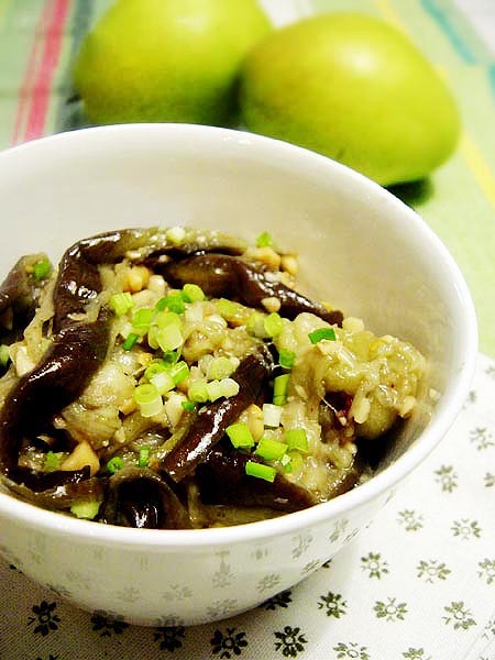 材料:茄子500克、炒香花生仁20克、盐、蘑菇精、醋、香油