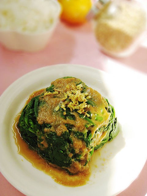 1、菠菜洗净后,放入开水锅里氽烫,然后捞出晾干水分。