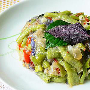 材料:茄子250克,豆角200克,青红椒各20克,辣椒面5克,米粉40克,紫苏叶若干