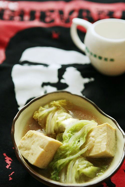 第二步:起锅倒油,油到五成热的时候倒入酱油翻炒,然后再放入白菜,等到白菜炒软后添水,水不用放特别多,只要末过白菜就可以了。水开后放入盐和冻豆腐,等到冻豆腐已经熟透这道菜就好了。