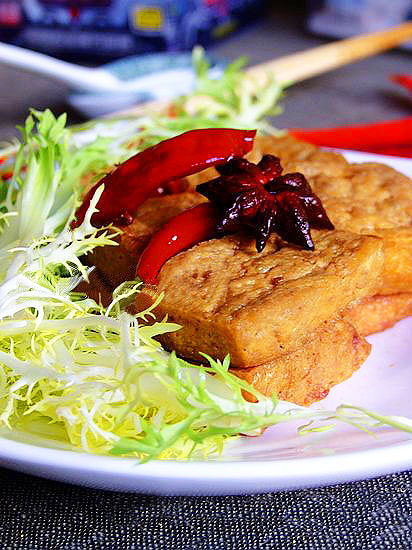 4、至豆腐四面金黄,捞出,趁热浸入卤水;