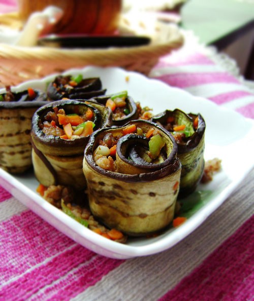 4、将炒好的素肉菜馅,放到茄片上卷好。