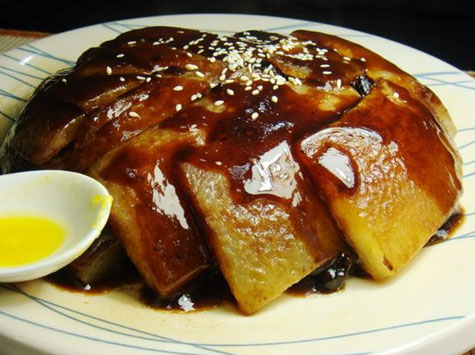 3、最后把煎好的冬瓜摆在一个较深的盘子里,将梅干菜倒在冬瓜上面,蒸20分钟。4、蒸好后,将盘子倒扣过来,多余的汁倒入锅里勾少许芡淋到冬瓜表面即可。