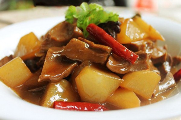 3、 炒锅放入少许花生油、放入姜片、干辣椒、八角、香叶、煸炒一会,加入白萝卜略炒一会、再加入炸好的笋干翻炒一会、加入、少许、盐、酱油、蘑菇粉、糖、调味、加入水、煮开后调至慢火炖煮40分钟左右后、勾少许芡汁、收干汤汁出锅装入盛器中即可。