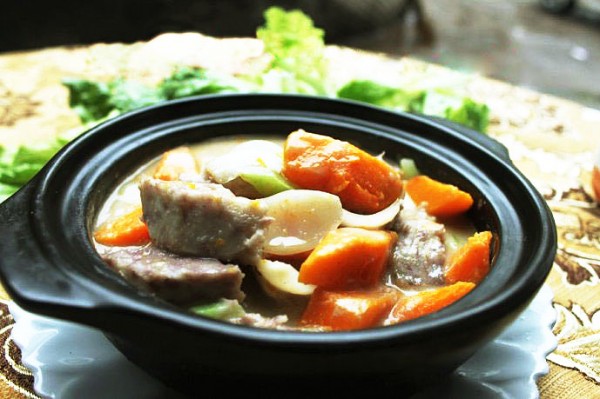 出锅倒入煲中、再将煲放到小炉子煮开勾少许芡汁即可上菜了。