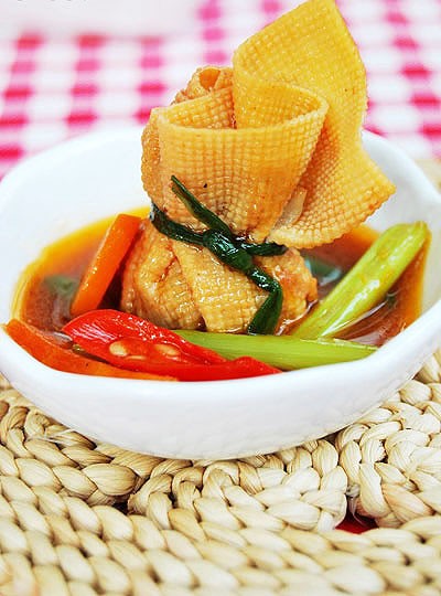 8、倒入蒸好的豆皮袋和汤汁,调入素肉酱,轻轻翻炒均匀;