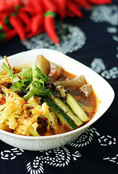原料:魔芋、黄瓜、豆芽、腐竹、花菜,郫县豆瓣、