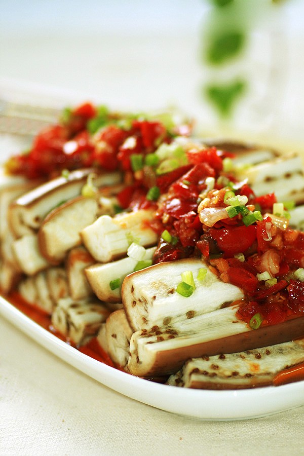 4、待茄条蒸好后取出,将炒好的剁椒倒在茄条上即可