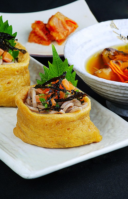 食材:豆皮包、荞麦(そば)面、松茸、山药、素三文鱼、香菜、青芥辣、紫苏叶、海苔丝、寿司醋、韩式泡菜