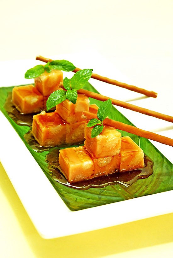 (8)藕凉后即可切丁粒状摆放在盘中,并浇入糖汁,用薄荷叶、巧克力棒点缀即可。