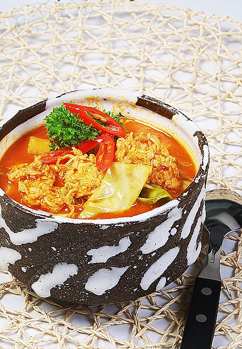 5. 锅内加入少许油,放入卷心菜煸香,放土豆、素鸡块、红咖喱加3杯水,大火烧开调小火略微煮一会儿。放盐、蘑菇精,不勾芡,出锅装在陶罐中,用红辣椒点缀。OK啦!