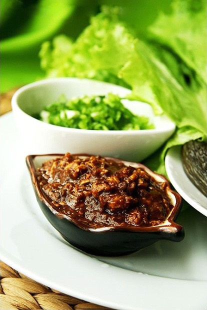 四、配料:把尖椒、蒜、香菜一起切碎,加入素肉酱,用来拌茄子、土豆或黄瓜都可以,尖椒的清香、加上蒜香,还有香菜,真是清清爽爽的开胃菜呀