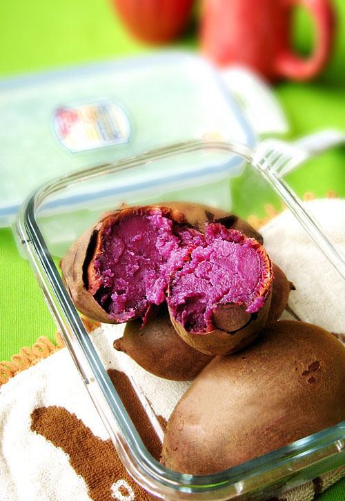 材料:紫山芋600克(最好挑选个头一致的地瓜,这样烤起来会比较均匀)。
