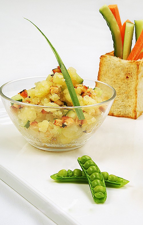 9.取不锈钢盆,放入步骤(5)土豆泥、步骤(7)素魚粒、步骤(8)黄瓜粒,调味少许盐、蘑菇精拌匀,装玻璃碟即可。