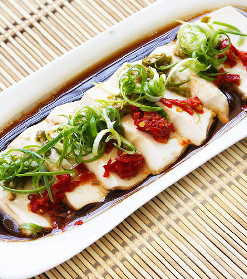4、关火后,将豆腐盘拿出,去掉保鲜膜,洒上沥干水的葱丝,烧中热油后泼上即可。