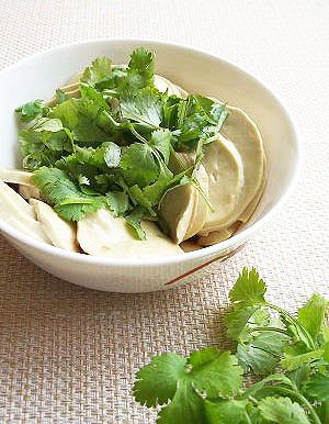 超市买的素鸡(一种豆制食品),洗净、切片,排在碗了,上锅蒸5分钟,蒸热、蒸透,取出。放上香菜碎,淋适量麻油、酱油和醋,就可以开动了。