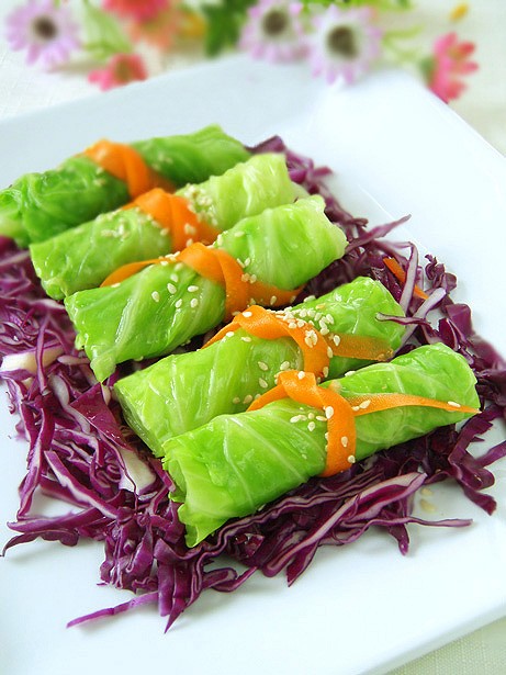 把所有的包菜卷摆放在切成丝的紫甘蓝上,撒上适量的熟芝麻。