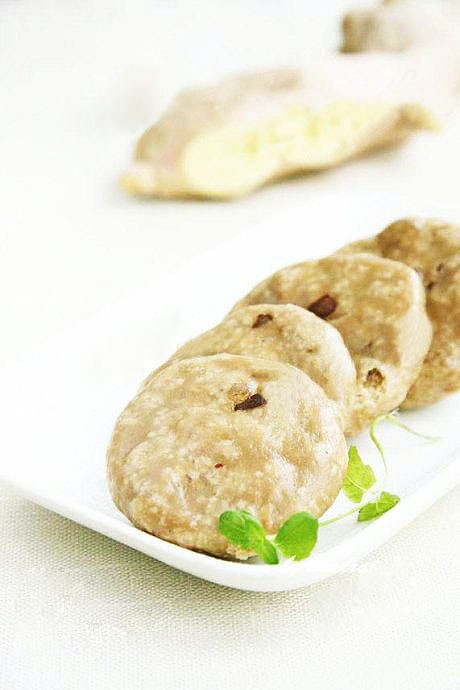 材料:姜100克,面粉150克,红枣、葡萄干适量
