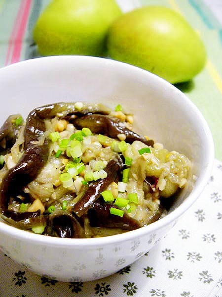 材料:茄子500克、炒香花生仁20克、盐、蘑菇精、醋、香油