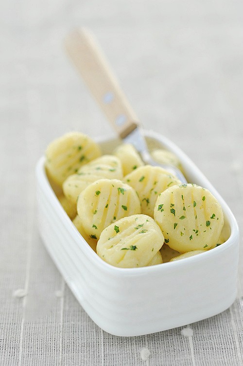 6)另取一只煎锅,将植物黄油放入锅中用小火溶化,饭后放入土豆饼,调入盐(1/2茶匙),法香碎,炒匀即可。