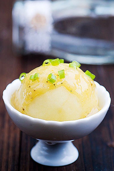 4、把手用清水沾湿,抓一把土豆泥,揉成球即可,浇上素高汤,大口开动吧。