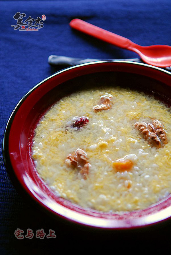 第3步再次煮开后关最小火,慢慢倒入打散的鸡蛋,关火,搅匀后放核桃碎即成