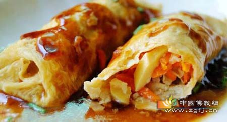 2、腐皮泡软,剪成长条包入蔬菜,卷紧。