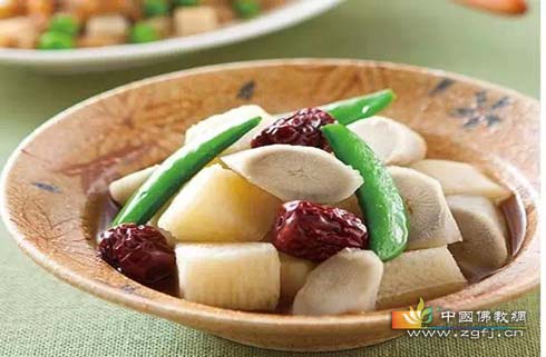 1、红枣洗净;甜豆荚挑去头尾后洗净;山药和牛蒡去皮、洗净后切块。