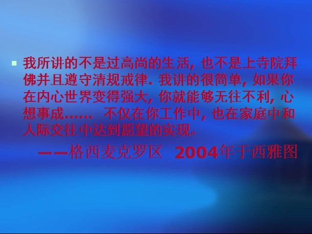 我们要很明智地发愿,给自己一个合理的时间段:“我三天之内不和老公发脾气。”而这三天你可以选择出差,或很少时间在家,因为他不在你面前,所以三天是一个合理的时间段。这样小小的成功会激励我们再继续发另一个愿,以便拉长间隔的时间,或是减轻生气的强度,或是马上忏悔等等。又如我的老板不听我的建议,想有效地把这个坏种子拿掉,我们可以保证自己不会再不听别人的建议至少一个星期或二个星期。总之,无法一次性断除的习气,至少我们要懂得如何抑制它,慢慢击破它。如同刨除一棵根部很大的树,我们只能一点点松动根部。