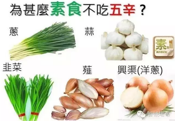 生西法师:五辛:大蒜、葱、荞头(小蒜)、韭菜、洋葱(兴渠)。