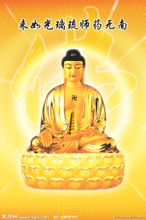 药师佛,梵文 Bhaişajya guru vaidūrya prabhārāja,又作药师如来、药师琉璃光王如来、大医王佛、医王善逝、十二愿王。为东方净琉璃世界之教主。据《药师琉璃光如来本愿功德经》载,日光遍照菩萨与月光遍照菩萨同为药师佛的二大胁士。日光菩萨与月光菩萨同为无量无数菩萨众之上首,依次递补佛位,悉能持药师如来之正法宝藏。药师佛面相慈善,仪态庄严,身呈蓝色,乌发肉髻,双耳垂肩,身穿佛衣,坦胸露右臂,右手膝前执尊胜诃子果枝,左手脐前捧佛钵,双足跏趺于莲花宝座中央。身后有光环、祥云、远山。