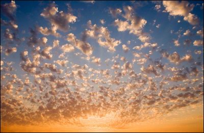 宁静的黄昏时期,太阳把部分天空照成了桔黄色,高空中风已经把云层吹散开。从地面观看,天空中的云朵像飘散的棉絮。