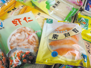 记者在市区吴桥路三角巷市场的一家素食批发商行内看到,摊位上摆着许多袋装的黑刺参、深海鲍鱼、素大龙虾、轻辣卤水素鸭等素食。如果不知道这是家素食店,很可能会误认为是平时食用的参、鲍鱼、龙虾,因为这些素食跟仿效的食品太相似了。