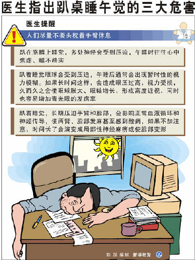 对此医生提醒,人们尽量不要头枕着手臂休息。首先,趴在胳膊上睡觉,多处神经会受到压迫,午睡时往往心中焦虑、睡不踏实。其次,趴着睡觉眼球会受到压迫,午睡后通常会出现暂时性的视力模糊。如果长时间这样,会造成眼压过高,视力受损,久而久之会使眼球胀大、眼轴增长,形成高度近视,同时也容易增加青光眼的发病率。另外,趴着睡觉,长期压迫手臂和脸部,会影响正常血液循环和神经传导,使两臂、脸部发麻甚至感到酸痛,如果不加注意,时间长了会演变成局部性神经麻痹或使脸部变形。
