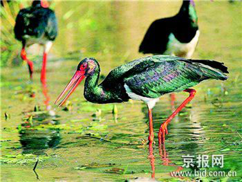 昨天,怀柔区林业局工作人员对区内白河流域进行湿地普查时,在汤河口镇大黄塘一带水域发现了多只国际濒危物种黑鹳。据初步观察,约有十多只黑鹳,都是来这里繁殖的,据了解,这次发现种群和数量之大在北京地区非常罕见。