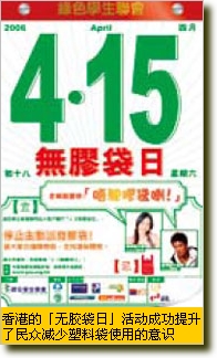 过去几年来,香港政府一直大力倡导减少塑料袋的使用。从2006年获得巨大成效的「无胶袋日」(No Plastic Bag Day)活动以来,参与活动的零售店已减少超过百分之四十的使用量。继此活动后,立法会议员也即将通过加征塑料袋环保税的法案,希望能进一步于一年内减少十亿个塑料袋的使用量。