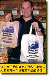 科尔斯湾(Coles Bay)是澳洲塔斯马尼亚岛(Tasmania)的一个小小区,早自2003年起,所有的零售商店便全面停用塑料袋。这是由当地的面包店老板班.奇尔尼(Ben Kearney)所发起,并得到镇上所有零售店的全力支持及参与。他们对替代塑料袋的布袋、纸袋的设计与价格取得了一致的意见,设定改换日期,再发给每户家庭五个免费的袋子,便大功告成了!