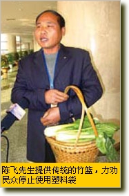 住在中国浙江省永嘉县的农民陈飞先生(Chen Fei),奔波全省,并横越全国,热忱地推动使用传统竹篮购物,以取代塑料袋。为了遏止住家附近的楠溪江遭到塑料废弃物的污染,他分送菜篮给当地居民和商家,力劝大众停用塑料袋,以期让家乡变成一个无塑料袋的净土。此后如众所周知,经过六年来不辞辛劳的努力,陈飞先生已发送了六千多个竹篮子,劝导许多人不要使用塑料袋。2006年,他荣获中国政府颁赠中国最受推崇的环保奖--地球奖。