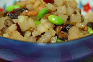 萝卜切小丁,香菇与虾干也切丁,油烧热后,下虾干和干辣椒段炒香,然后下萝卜丁,炒一会把萝卜炒透,下点料酒,盐,味精,胡椒粉,白糖,鸡精,下点煮熟的毛豆,再炒 一会,淋点香油,就好了!