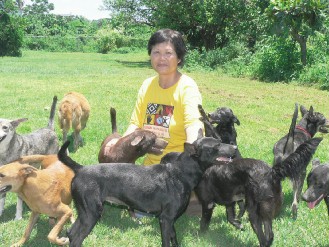 花莲县保护动物协会给流浪犬最舒适的空间与照顾,狗儿围在理事长冯少敏身边撒娇。