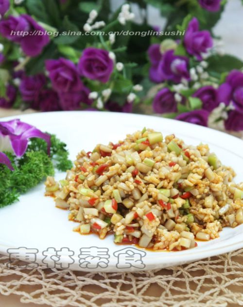 (2) 将杏鲍菇洗净放入锅里煮熟,冷却后同样切红豆大小的粒,放入碗内,加细盐(少量)、白胡椒粉、素易鲜搅匀上味,再加少许生粉拌匀,放进冰箱冷藏室或阴凉处醒发30分钟备用。