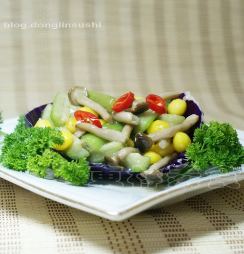 (5) 锅中倒入油,分别把丝瓜、蟹味菇、银杏泡油20秒种倒出沥干油。原锅放少许油煸香姜末及红辣圈然后加少许水调味勾薄芡,放入丝瓜、蟹味菇、银杏搅拌出锅装在紫甘蓝上即可。